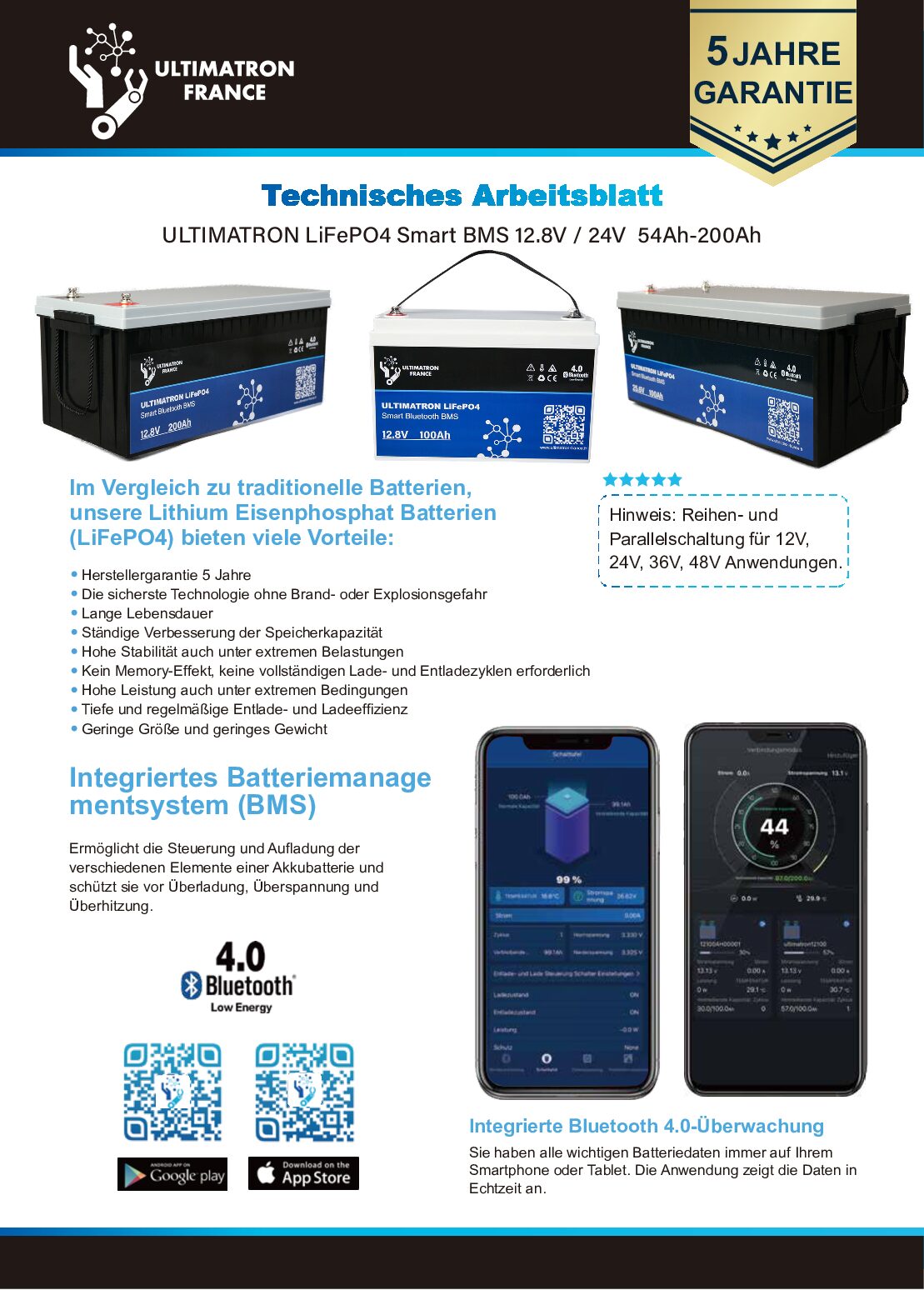 Die UBL-12-200 verfügt über ein integriertes Batteriemanagementsystem (BMS), das die Batterie beim Laden und Entladen überwacht und sie laut Datenblatt vor Überladung, Überspannung und Überhitzung schützt. Über die integrierte Bluetooth 4.0 Überwachung lassen sich wichtige Batteriedaten bequem auf dem Smartphone oder Tablet anzeigen. Laut Datenblatt ist die Batterie außerdem für Reihen- und Parallelschaltung in 12V-, 24V-, 36V- und 48V-Anwendungen geeignet und wird mit 5 Jahren Herstellergarantie angegeben.